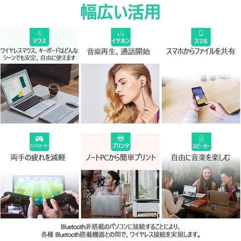 お使いのデスクトップコンピュータ をBluetoothのタッチキーボード、マウス、ヘッドセット、ヘッドフォン、スピーカー、プリンター、タブレット、カメラ、ゲームパッド、ゲーミングコントローラーなどとワイヤレスで接続できます。※本製品はAppleのAirpods、MicrosoftのMouseと交換性が無いです。