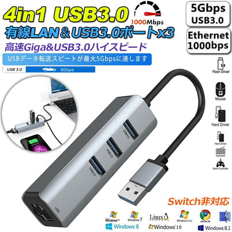 USB3.0ハブ 1000Mbps 有線LAN 4ポートアダプター RJ45 変換アダプタ 5Gbps高速 USB拡張 高速伝送 USB3.0ポート×3 ネットワークコンバーター ギガビット MAC Windows OS Linuxなどに対応 送料無料