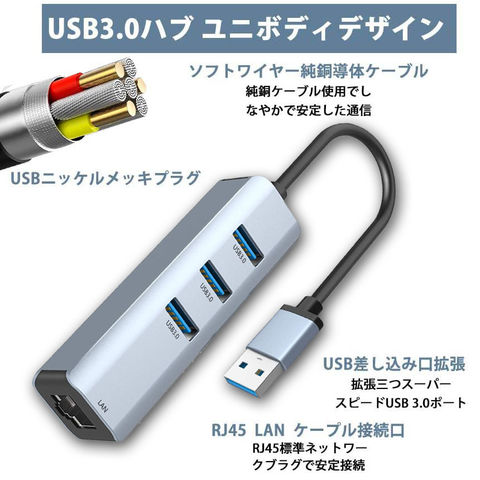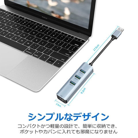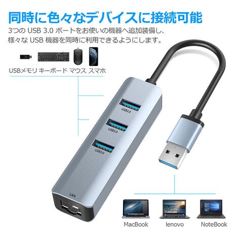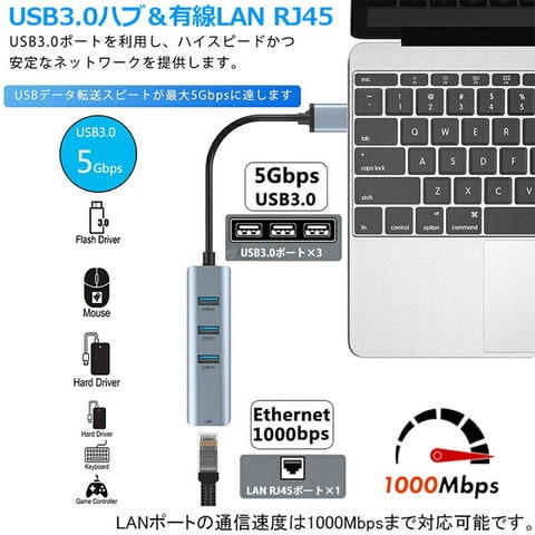 有線LANポート&USBポート付きハブ: USBポートをLANポート(RJ-45コネクタ)に変換するアダプタです。拡張三つUSB 3.0ポートをお使いのデバイスにつなぐことで最大5Gbpsのデータ転送速度を実現して、HD動画も数秒で転送可能です。