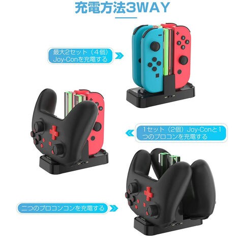 【多機能充電スタンド】Nintendo Switch用 Joy-Con&Proコントローラー充電スタンドがいよいよ発売。「充電方法1:Joy-Con×4台」、「充電方法2:Joy-Con Proコントローラー×2台」、「充電方法3:switch Joy-Con×2台+Proコントローラー×1台」【LED ライトインジケーター】 明確なデュアル色のLED ライトインジケーターが充電状態を示します。Joy-Con/Proコントローラーの充電状態が分かる便利なステータスランプ搭載でJoy-Con/Proコントローラーの充電完了を個別にお知らせする。