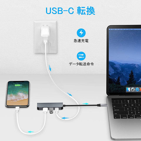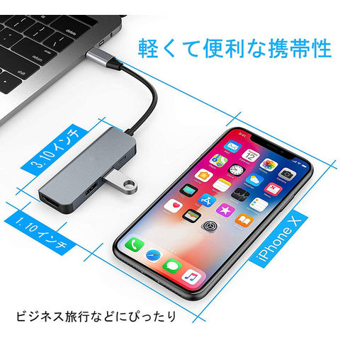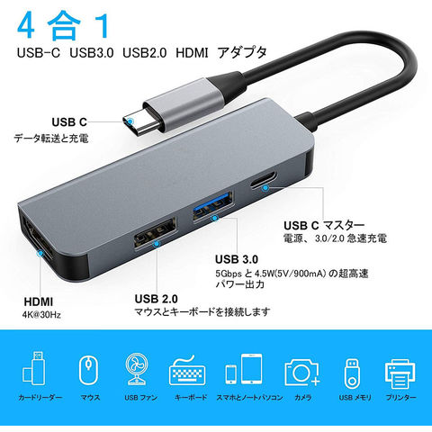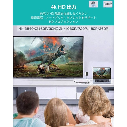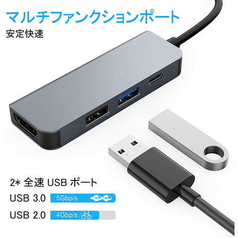 【USB Type C ハブ】4ポートが揃っているドッキングステーションです。USB3.0ポート*1、USB2.0ポート*1、HDMIポート*1、PD充電ポート*1を備えます、複数のデバイスを繋いでも安定に動作します。Type-Cインターフェースはコンピュータまたは携帯電話に対応し、同一画面でオーディオとビデオ、テキストファイルデータを読み込めます。【4K HDMIビデオ出力】USB C HDMIアダプタで4K UHD或は1080Pの映像をHDTV、デイスプレイやプロジェクターに出力できます。アダプタミラーリングとMACブック、Chromeブック、または他の標準USB-Cインターフェースを使用し、パソコン本体に供給し、HDMIと同じスクリーン効果を実現できます。