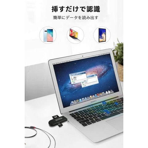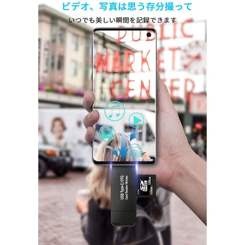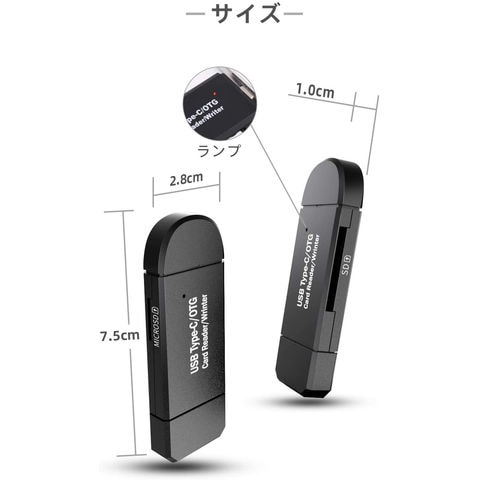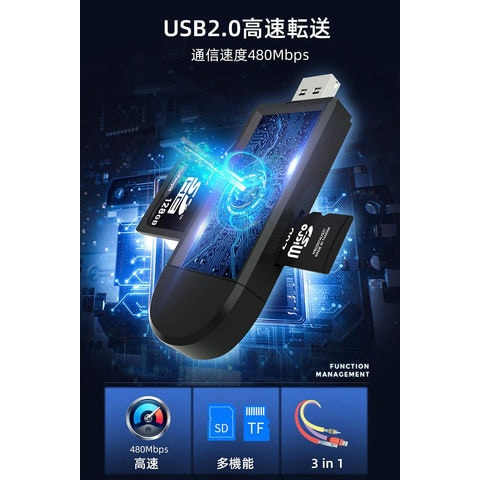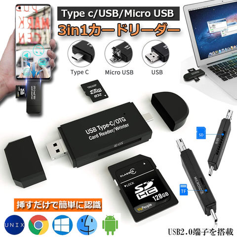 【USB2.0対応の専用カードリーダ】各種USB2.0端子を搭載するデバイスに適用しています。パソコンはもちろん、タブレットやスマホでも使えます。最大伝送速度480Mbpsの高速データ転送体験を実現しています。【3in1カードリーダー】Type-cとMicro USBとUSB2.0の3種類の端子を組み合わせで、PCやOTG機能対応のタブレットやAndroidスマートフォンのデータ転送に最適します。(ご注意:Type-cはsonyには対応していないです。)