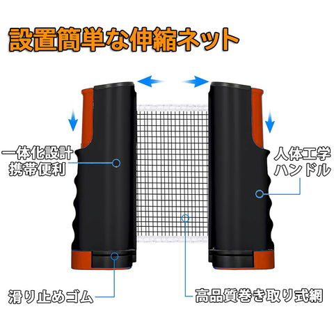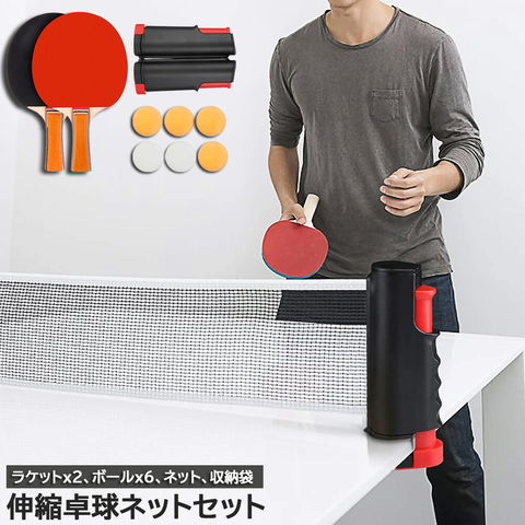 【携帯型伸縮ネットラック仕様】卓球セットネットの長さ(横幅)は可変式なので、本格的なプレーを楽しむことも、お子様用に小さな台を作ってあげることも可能です。材質:PEプラスチック、人体工学の応力ハンドル+高度変形防止ネットラック+リバウンドボタンを採用しております。【セット内容】ラケット2本、伸縮ネットラック1本、ボール6個、収納バッグ。
