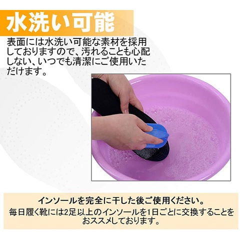 【水洗い可能】インソールは水洗い可能ですので清潔にお使いいただけます。インソールを完全に干した後(ねじてはいけません)、再び使用します。毎日履く靴には2足以上のインソールを1日ごとに交換することをおススメしております。