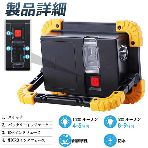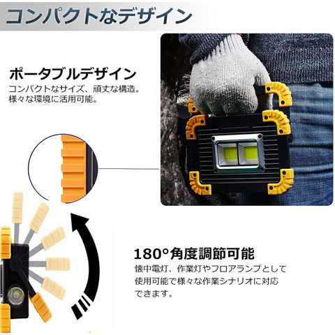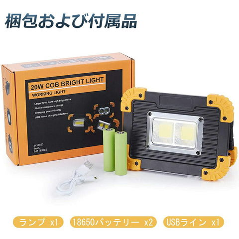 【2個セット】LED 充電式 投光器 20W ポータブル 作業灯 緊急照明 屋外照明 ワークライト usb 充電式 LED投光器 自動車整備 アウトドア キャンプ 旅行 夜釣り ランニング 防災 地震 バッテリー付き 180°角度調整可能