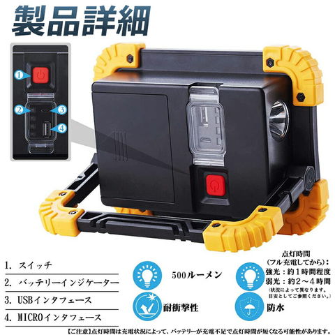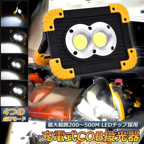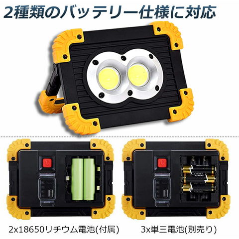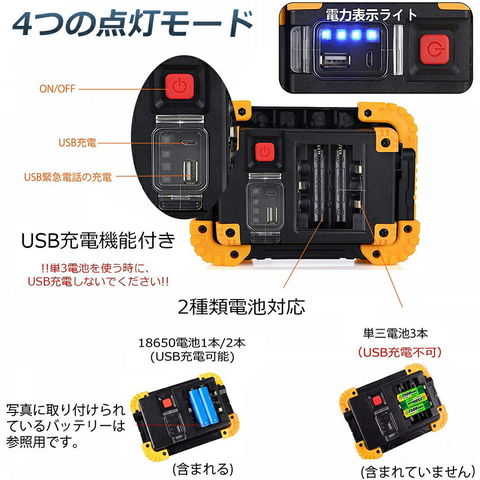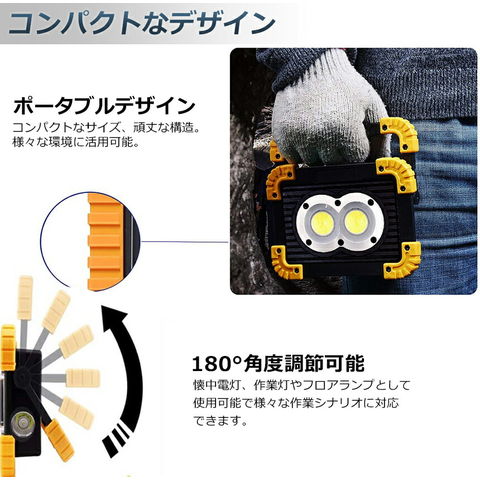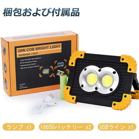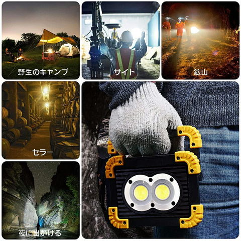 【超高輝度】最大範囲:200~500M ハイパーワLEDチップを採用しており、120度の広角反射板に、鱗型が採用されるため、より広く均一な照明を提供します。 COB 20W、500mの明るさで暗いところを幅広く照らす整備作業灯として機能的に十分で、夜間作業は楽ちん!キャンプ、アウトドア、災害時の非常ライト、製造ライン、自動車整備、工事現場、倉庫作業、トラック荷台作業、車載用などに大活躍.【USB給電&充電】USBコネクターを接続して簡単に給電します。2本 3.7V 18650リチウム、付属のUSBケーブルで充電可能!充電しながら使用することができます。また、3本AA電池を使用することができます。