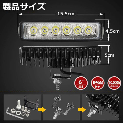 【製品仕様】:16.0(L)x5.0(W)x6.0(H)CM。 LED電力:18W (3W型高輝度LEDx6個)。 色温度:6000K、ホワイト発光。 全光束:1500 LM。ビーム角:スポットビーム。【性能】:IP67防水等級、100%防塵、防水、最大1mの水を30分間防水。防水、防塵、耐衝撃および抗爆発。アルミ基板なので、高温にも耐えられる非常に優れた耐熱性・放熱性を実現!!!さらに強い耐食性と一定の絶縁性を持って、とっても便利です。