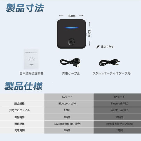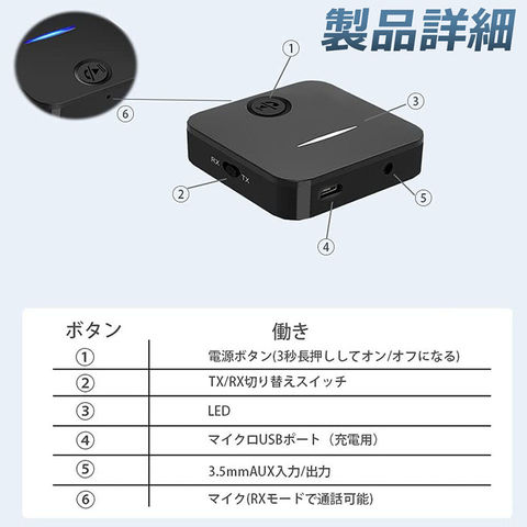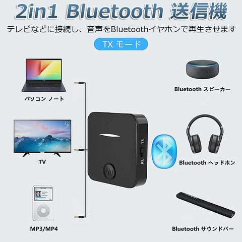 【一台二役】本製品は送信と受信の両方に使用可能なBluetoothオーディオトランスミッター&Bluetoothオーディオレシーバーです。送信機モードや受信機モードはワンタッチで簡単切替えできます。送信機(TXモード):Bluetoothに対応していない携帯オーディオプレイヤーやテレビと繋いで、Bluetooth対応のスピーカーやヘッドセットなどと接続ができます。受信機(RXモード):Bluetoothに対応していないイヤホンやヘッドホンを繋いで、Bluetooth対応のスマートフォンや携帯オーディオプレイヤーなどと接続ができます。※通話はできます。