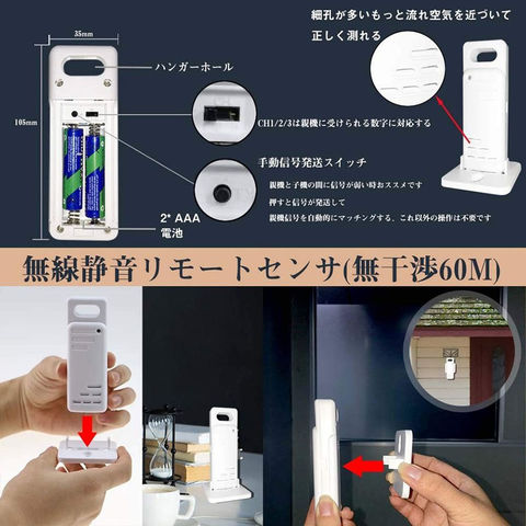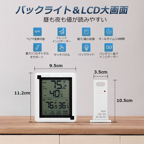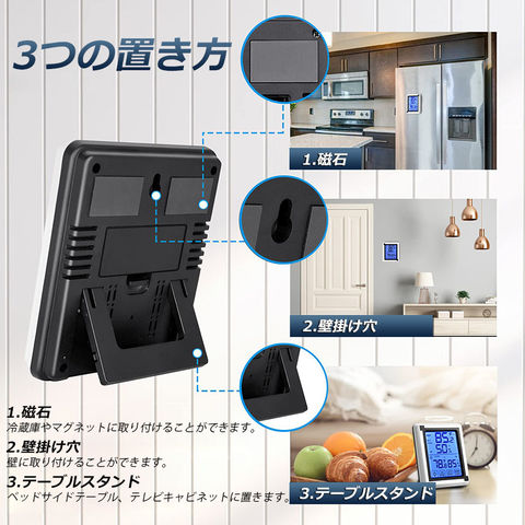 【室内外温湿度】最大3台の子機を接続することができます、子機はハンガーホールに吊るすことができますし、水平面に立つこともできます。XP3級耐水。室内温度湿度計は卓上スタンド・マグネット・壁掛け用フック穴が付いているので、自宅の様々な場所に設置出来ます。