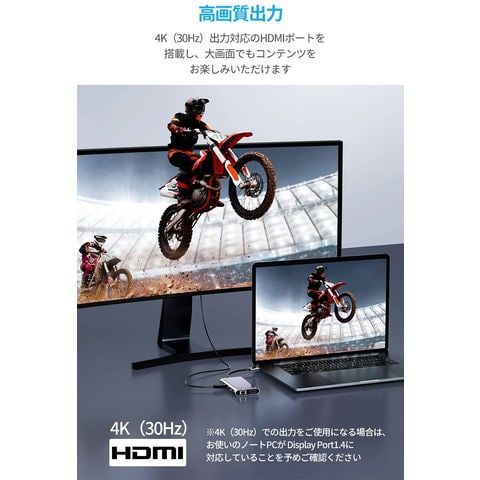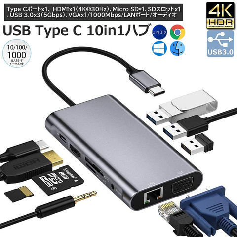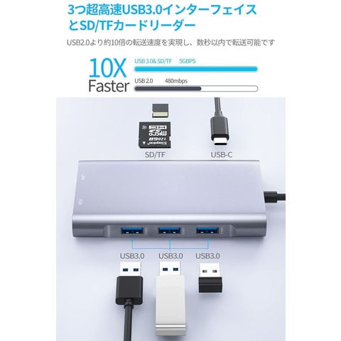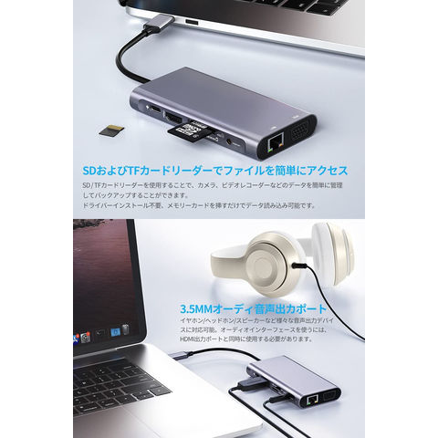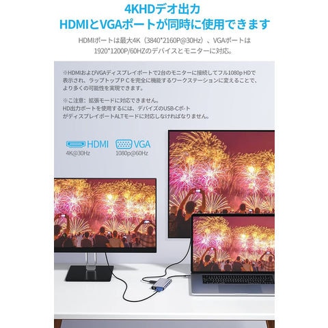 【幅広い機能】1つの4K 30Hz HDMIポート、1つの1080P 60Hz VGAポート、1つの1000Mbps LAN ポート、1つのUSB-C充電ポート、microSD&SDカードスロット、3つのUSB-A3.0ポート、1つの3.5mm Audioポートに接続が可能です。ノートパソコンに必要なすべてのポートを、コンパクトなハブにまとめました。【複数のディスプレイに接続】1つのHDMIポートと1つのVGAポートの併用により、1つのディスプレイに接続することが可能です。HDMIポートは最大4K(3840*2160P@30Hz)、VGAポートは1920*1200P/60HZのデバイスとモニターに対応。※拡張モード対応できません。HDMIとVGAが同時に出力した場合は、1080Pになります。※ご注意:HDMI出力ポートを使用するには、デバイスのUSB-Cポートが出力対応可能でなければなりません。※本制品はlan経由のネットワーク接続に対応しており、wifi経由の接続には対応していません。