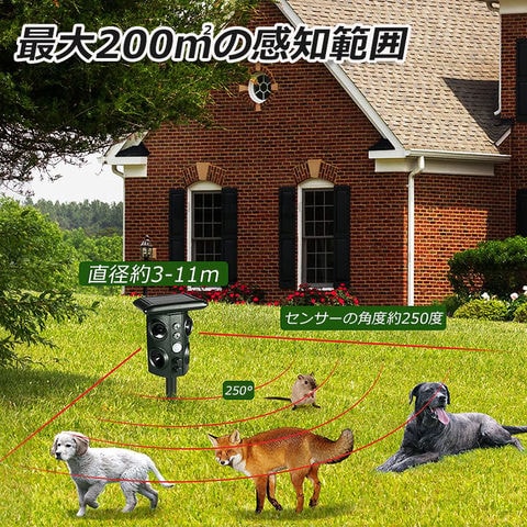 赤外線自動感知センサー範囲:左右角度180°、上下角度60°、直進最長10m、広さは約200m2までカバー可能です。(動物のボリュームによって、感知範囲が違います)わずか1-2週間ぐらいで動物の糞尿、食害、騒音、足跡などの悩みから解放されます。「空き巣対策」防犯用品として利用可能で、音・ライトで不審者を驚かせ、キャンプ場害獣撃退にも利用可能です。