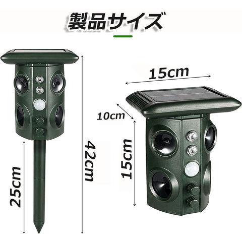 超音波+強力LEDフラッシュライト+機械波発振(模擬耐震機能)+自動混合モード(1ー2ー3ー4モードを繰り返します)、高効率的に動物撃退できます。4個の超音波スピーカー付きで、動物撃退の有効範囲が300m2になり、対応動物種類も増えております。超音波の周波数とセンサー感度が調節でき、また超音波発振周波数は各都度によって自動的に変動し、動物の慣れを防ぎます。弊社の動物撃退器は人体、環境に悪影響が与えないので、ご安心使用いただけます。
