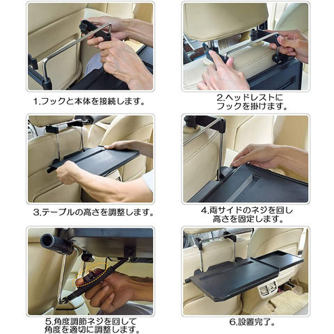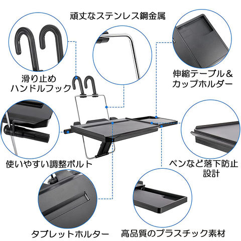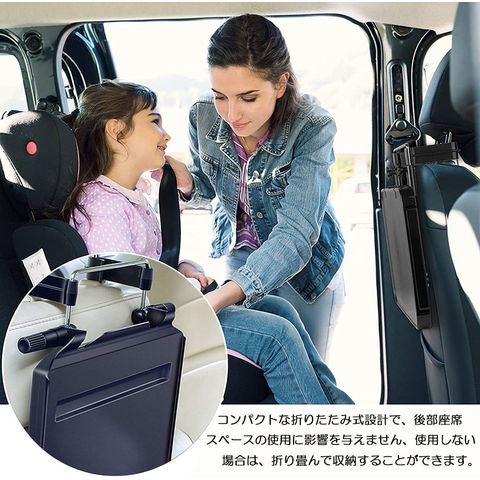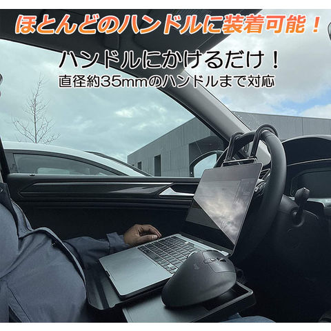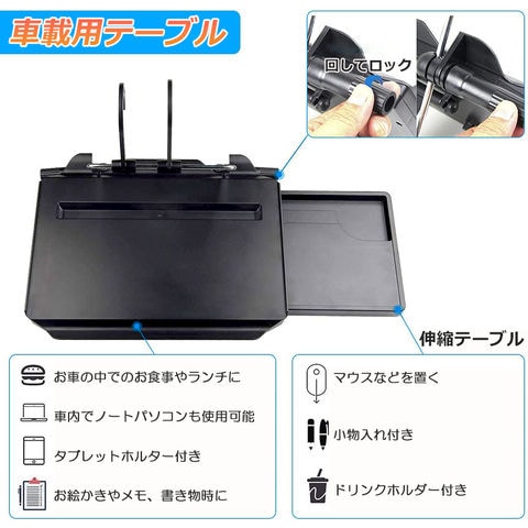 【運転席&後部座席兼用】車のハンドルや後部座席に吊り下げて使える簡易テーブル。車移動が多いビジネスマンの必須アイテム。食事、PC、事務作業、休憩に使いやすいです。本製品にタブレットホルターやカップホルダー、小物入れがついておりますので非常に便利です。