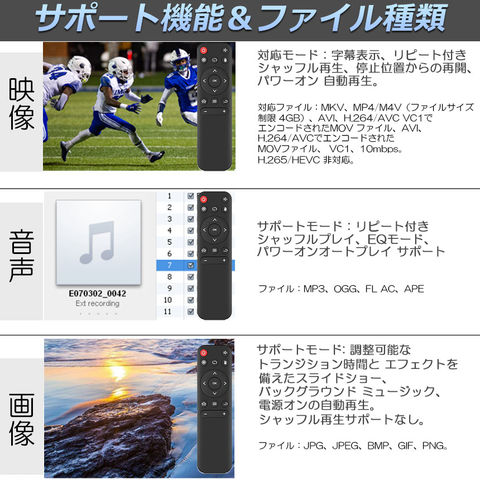 【簡単接続】 電源ケーブルとモニターケーブルを繋ぐだけの簡単設置!! あとは映像を記録させたUSBorSDorHDDを挿して、リモコンで再生させるだけ!! 操作メニューは日本語対応!!【多種ファイル形式に対応】 主要なAVI/FLV/MPEG-4/H.264のほか、合計12種類の映像ファイル形式に対応!! さらにMP3などの9種類の音楽ファイル形式、4種類の画像ファイル形式に対応!!