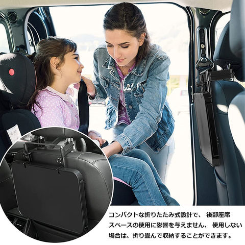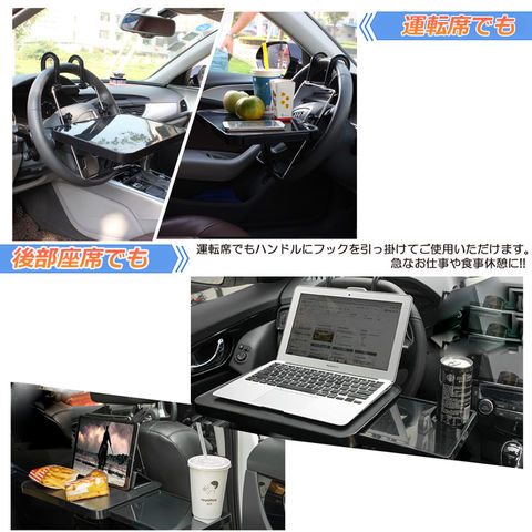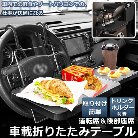 【簡単取り付け】 車のハンドルやヘッドレストに引っ掛けるだけで簡単に装着できる、ハンドルテーブルです。 ドリンクホルダーの付いた便利なスライド式サイドテーブルも付いています。