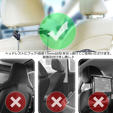 【運転席・後部座席に対応】 直径約34mmのハンドルまで装着可能です。 取外し可能なフックを付け替えることで、ヘッドレストに取り付けることができるので、後部座席のテーブルとしても使用できます。 運転席はハンドル、後部座席はヘッドレストに装着します。