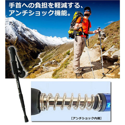 【アンチショック】スプリングが内蔵された衝撃吸収システムは肩、ヒジ、手首への衝撃を25~30%軽減してくれるので、手首の痛みを緩和してくれる働きがあります。険しい道では役立つのでハードな登山に最適です。