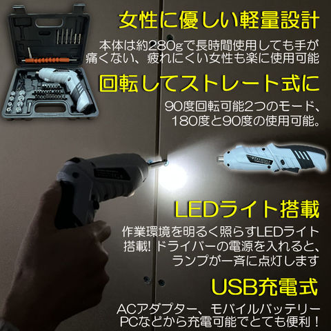 【小型軽量&多用途】小型でコンパクトの電動ドライバーは、グリップにはラバー加工で、滑り止め、しっかり握ることができ、様々な場合に利用できます。疲労感を緩めて、片手で操作することができます。 家具、電気機器などの組立をするだけでなく、木材・アルミ金属などの加工も適用します。(※注意:厚く硬い金属や壁など場所に利用しないでください。)