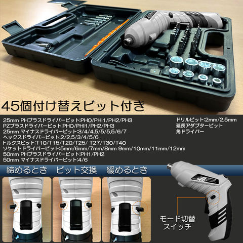 【47点セット】25mm CRVビット20本(プラスビット--PH0/PH1/PH2/PH3/PH4;マイナスビット--SL2/SL3/SL4/SL5/SL6;ヘックス--H2/H3/H4/H5/H6;トルクス--T10/T15/T20/T25/T30)、50mm CRV プラスビット2本(SL4/PH2)、HSSツイストドリル2本(2.0/3.0)、六角ソケット5個(7mm/8mm/9mm/10mm/11mm)、全部32個ビットが付属して、USB電源ケーブル、50mm ソケットコンロッド、50mmビット延長アダブター