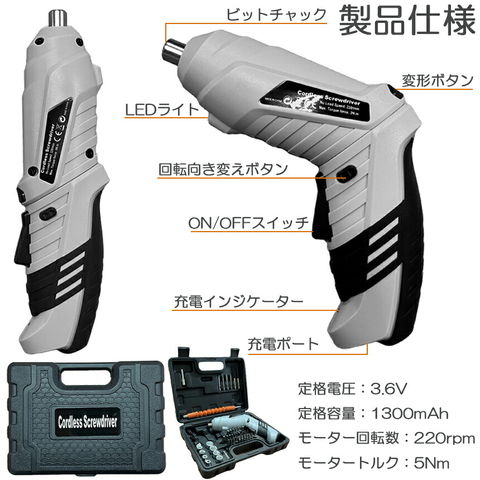 【3個セット】電動ドライバー 充電式ドリルドライバ セット 電動ドリル 充電式 47点セット 1300mAh容量 正逆転切り替え コードレス 小型 コンパクト 2Way LEDライト付き ケース付き トライバードリル ドリルドライバー DIY 大工
