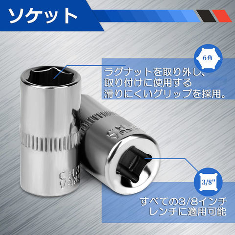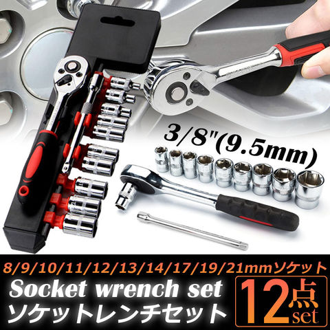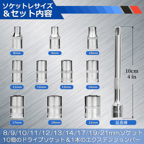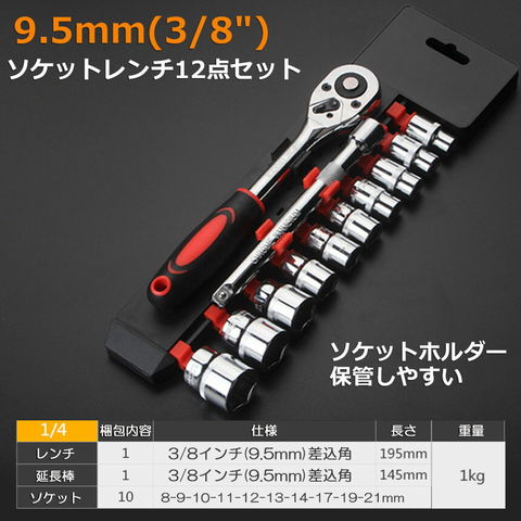 【セット内容】差込角9.5mm(3/8インチ)のツールセットです。クイックリリースラチェットハンドル×1、エクステンションバー×1、ソケット12pc(8、9、10、11、12、13、14、17、19、21mm)。【材質】ソケット及びハンドルの材質は錆ににくい高品質なCrvです。完全的に熱処理され、耐久性を実現しました。