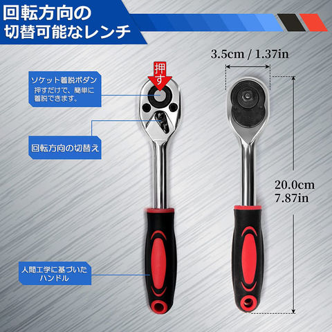 【特徴】ラチェットハンドルはクイックリリースのデザインで、ソケットの脱着はボタンを押すだけで簡単にできます。作業中に手が当たりにくいようにハンドル部はオフセットされています。