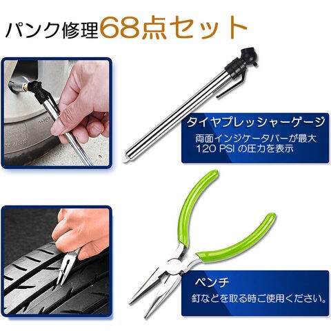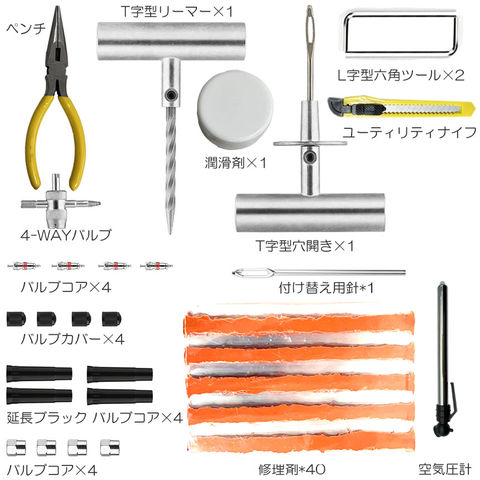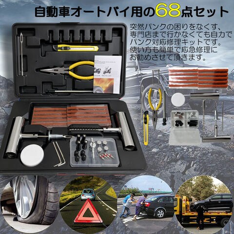 【確実に修理ができる】突然パンクの困りをなくす、専門店まで行かなくても自力でパンク対応修理キットです。使い方も簡単で応急修理にお勧めさせて頂きます。【セット内容】合計68点セット リーマー*1 穴開き*1 プライヤー*1 リーマー備品*1 カッター*1 六角レンチ*2 グリス*1 補修シール材*40 タイヤゲージ*1 バルブコア*4 バルブ多用途レンチ*1 バルブキャップ*12 リーマー備品*1 収納ケース*1
