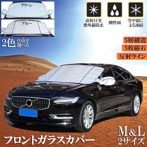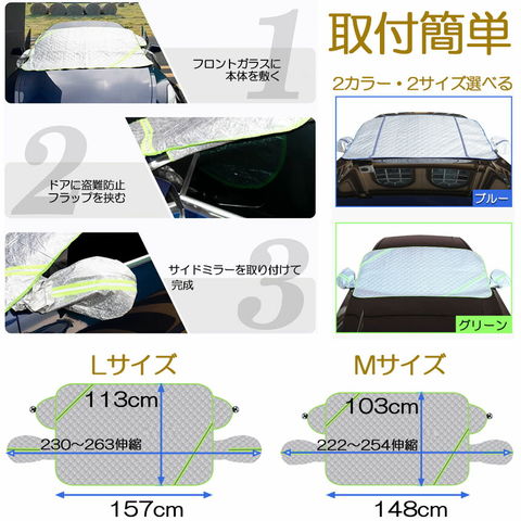 【凍結防止&積雪対策】従来の薄手モデルと違い、5層構造の厚手の素材で、寒い朝に車内の雪や霜、氷を取り除く必要がありません。 取り外し簡単!2カラー:グリーン・ブルー。2サイズ:M(148x103cm)・L(157x103cm)。【高品質素材】精密な縫製により、車のフロントガラスを雪、霜、氷、風、ほこり、紫外線などから守り、凍結を防ぎます。 他のカバーよりも厚く丈夫な作りになっているので、防寒・耐霜だけでなく保温性にも優れています。 表面素材はアルミホイルで、傷がつきにくく丈夫です。 裏面はPEフィルム採用で防寒、雪が降っても凍りません。