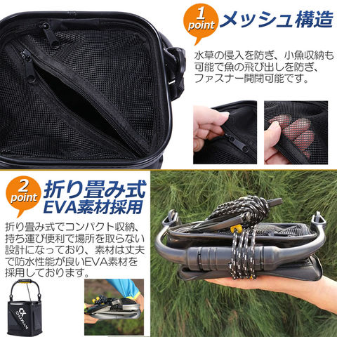 【便利なメッシュカバー】ファスナー付きメッシュ蓋つきで魚が逃げることも無く、簡単に水替えでき、そのまま海中へ沈めておくことも可能です。また、5メートルのロープ付き水辺まで距離がある場所でも簡単に水汲みができます。