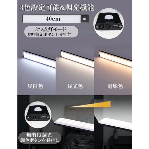 【4個セット】LEDセンサーライト 人感センサーライト キッチンライト フットライト LEDバーライト 色温度/明るさ調整可能 40cm 3段階調色 電球色 昼白色 昼光色 超薄型設計 非接触 USB充電式 ケーブル付き 卓上LEDライト 無段階調光 手元灯 流し元灯 台所 間接照明 工事不要