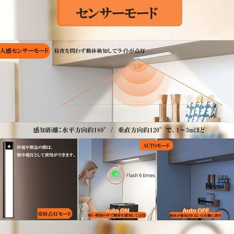3、AUTOモード:暗い環境(寝室/廊下/玄関/押し入れ...)の中で動体を感知して点灯し、節電し、省エネ、電池の使用時間を延長します。