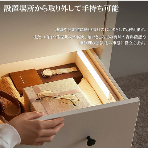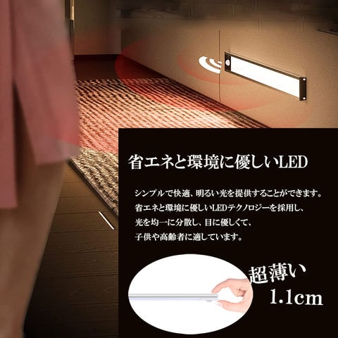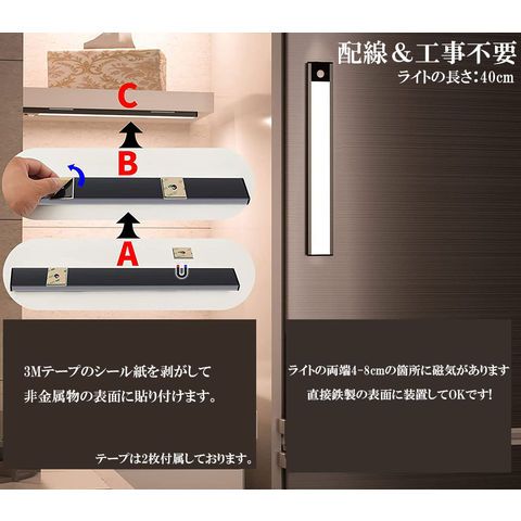 【取り付けが簡単&マグネット式】方法1、センサーライトの両端には強力マグネットが付き、金属表面(冷蔵庫のドアなど)に直接吸着できます。方法2、パッケージ内の2枚の金属テープを取り付けたい場所に貼り付けてから、灯体を金属テープに直接吸着できます。マグネットとライト本体は分離可能。お手軽い階段・寝室・廊下・玄関・キッチン・ガレージ・倉庫・戸棚などご装置したい場所に貼り付けできます。