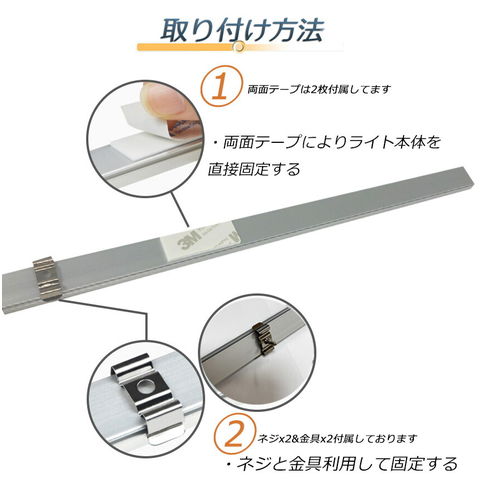 【強力両面テープ/ネジ付き】取り付けには両面テープやネジ提供します、金属、プラスチック、材木、ガラスなどいろんな場所にぴったり吸着することができます。好きな場所にバーライトを簡単に装着できます。