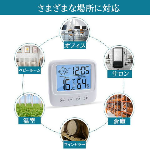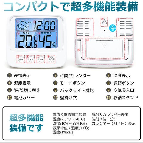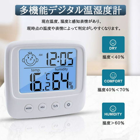 デジタル 温度計 湿度計 温湿度計 小型 コンパクト 多機能 時計機能 バックライト付き 大画面 見やすい 表情表示 アラーム付 時計 目覚まし時計 卓上 壁掛け 華氏 摂氏 大画面 熱中症 乾燥対策 室内 赤ちゃん 風邪 おしゃれ 温湿度管理 体調管理 携帯可能