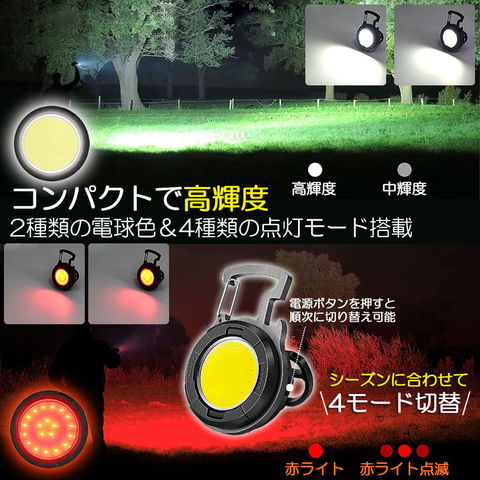 【ミニサイズ】ミニCOB投光器の重さはわずか45gです。 キーホルダーのデザイン採用、外出時バッグ掛けまたキーを持ち運びして、ポーチに入れたり便利に持ち歩けます。【4つの調光モード】高輝度(白)、低輝度(白)、点灯(赤)、点滅(赤)4つのモードを自由に切り替えることができます。小型ながらも驚くほどの高輝度最大300ルーメンを出力できます。また、低輝度も柔らかく目に優しい です。