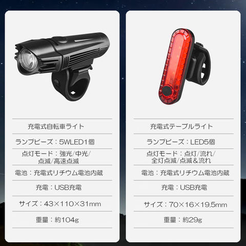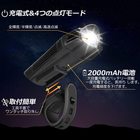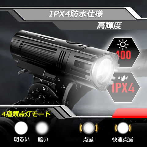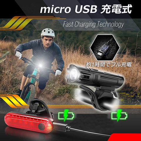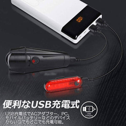 【USB充電式】: USB 充電式自転車、ヘッドライト用の内蔵 2000mAh 充電式リチウム電池、テールライト用内蔵 330mAh 充電式リチウム電池。【4つのライトモード】: ヘッドライトとテールライトは、ワンタッチスイッチで好みに応じて4つの異なる照明モードを備えています。