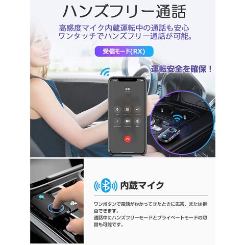 【音声アシスタント・ハンズフリー通話・Bluetooth非対応車での音楽再生】Bluetooth送受信機と、車との相性は抜群です。Bluetooth非対応のカーステレオでも、Bluetoothに接続した端末の音楽を再生できます。さらに、、本機には、ミニマイクが内蔵されているので、本機に向かって、音声アシスタントに命令し、曲の変更や、電話をかける、メッセージの送信などもスムーズにできます。通話中にボタンを長押しすれば。ハンズフリー通話モード/携帯でのプライベート通話モードの切替も簡単です!運転中も安全にスマホの機能を楽しめます。