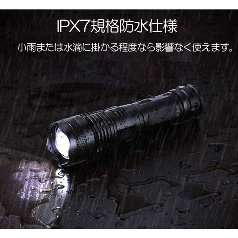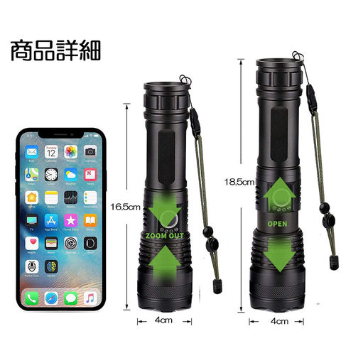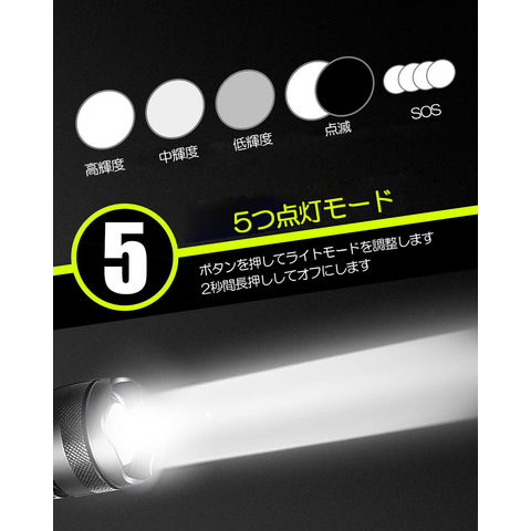 【10000 高ルーメン懐中電灯】耐久性のあるLEDチップ使用、最大ビーム距離500メートル (1640フィート) 、部屋全体を簡単に照らしたり、最大1600フィート離れたところの物に焦点を当てたりできます。 長距離観測に適した強烈スポットライト。【5つの照明モード & 調節可能なフォーカス】5つの照明モードを備えた高ルーメン懐中電灯: 強/中/低/点滅/SOS、ズーム可能な懐中電灯でズーム可能な光を実現し、広い範囲の投光器やスポットライトを発します。 安全で信頼性が高く、使いやすいです。 キャンプ、登山、ハイキングなどに最適な懐中電灯です。