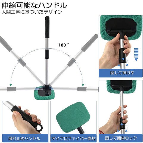 【力が入りやすく汚れが落ちる】ウインドモップで車のフロント・リアガラスなどの手が届きにくい所に楽々全体を奇麗に拭き上げできます。【握りやすい新設計グリップ】ハンドルの先にモップが付いているだけという、一見すると何のヘンテツもないアイテムですが、これが超便利。柄が24-44cmの伸び縮み自由自在で、遠・近あちこちのホコリをキャッチし、手を汚さずに楽々お掃除!