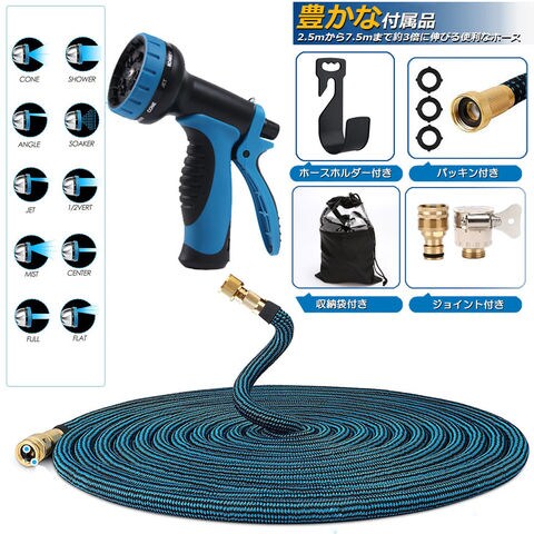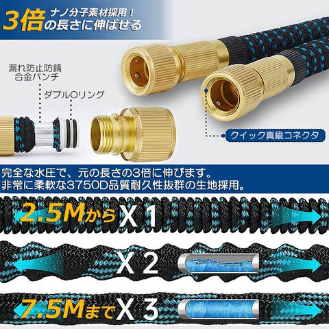 【3倍に伸びる】:収納時2.5m、最大7.5m、ホースを蛇口に取り付けてると、2.5mから7.5mまでホースが水圧で約3倍に伸びる便利なホース。(水圧によって最大限まで伸びれない場合があります)【超軽量素材】:使用しない時は、ホースの重量はわずか490gです。従来のゴムホースのような面倒くさい収納法に対し、伸縮ホースは超軽量素材を利用して全然重くないですから、誰でも楽にご収納いただけます。