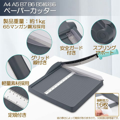 【耐久性ペーパーカッター】本裁断機は耐久性ABSプラスチック台座と鋭利な65マンガン鋼刃を採用し、紙の束を簡単にカットできます。裁断機は紙を305mmの長さに切断でき、一度に最大16枚のコピー用紙を裁断可能です。【製品仕様】製品サイズ:347X310X40mm、重量:約1kg、切断可能サイズ:305x305mm、ペーパーカッターの適用可能な切断範囲:A4、A5、B5、B6、B7