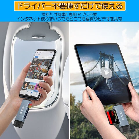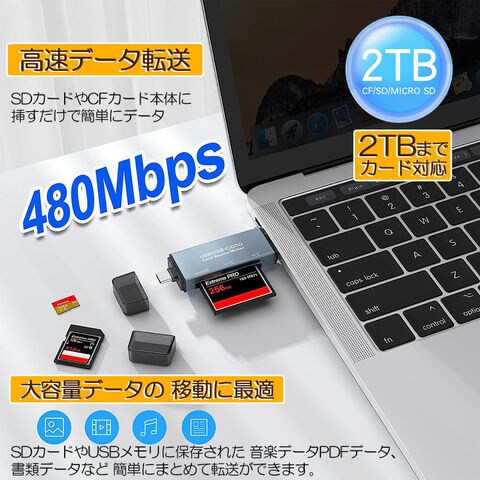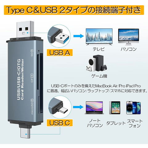 【USB2.0対応の専用カードリーダ】各種USB2.0端子を搭載するデバイスに適用しています。パソコンはもちろん、タブレットやスマホでも使えます。最大伝送速度480Mbpsの高速データ転送体験を実現しています。2in1カードリーダー】Type-cとUSB2.0の2種類の端子を組み合わせで、PCやOTG機能対応のタブレットやAndroidスマートフォンのデータ転送に最適します。(ご注意:Type-cはsonyには対応していないです。)
