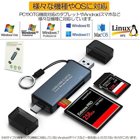 ・OTG付きのメモリカードリーダーで、パソコンやOTG機能付きのAndroidスマートフォン/タブレットをサポートしています。