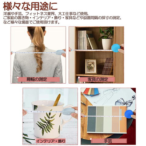 【幅広い使用範囲】 様々なシーンでも適用します。ウエスト、ヒップ、バスト、頭囲、手首などを測るのに適用します。身体のサイズの測定だけでなく、テーラー、家具、生地、服、手工芸品などにも大活躍します。巻尺の素材は柔らかいので、形状アイテムがどんなものであっても測定でき、周囲測定の時に重宝します。