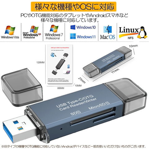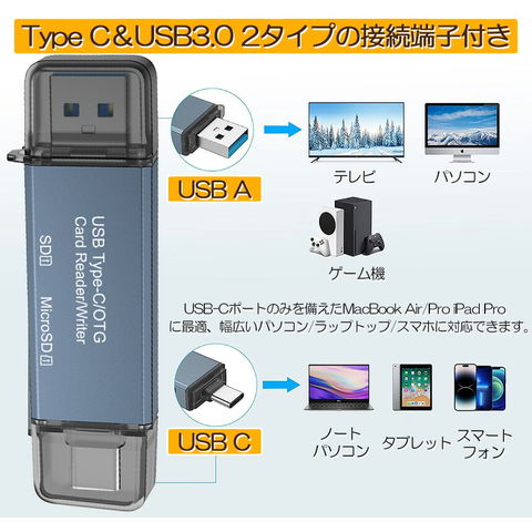 SDカードリーダー カードリーダー SDメモリーカードリーダー メモリ USB3.0 Type C マルチカードリーダー OTG SDHC SDXC SD Micro SDHC Micro SDXC MMC RS-MMC CF カード対応 データ転送 Type-C USB接続 パソコン タブレット