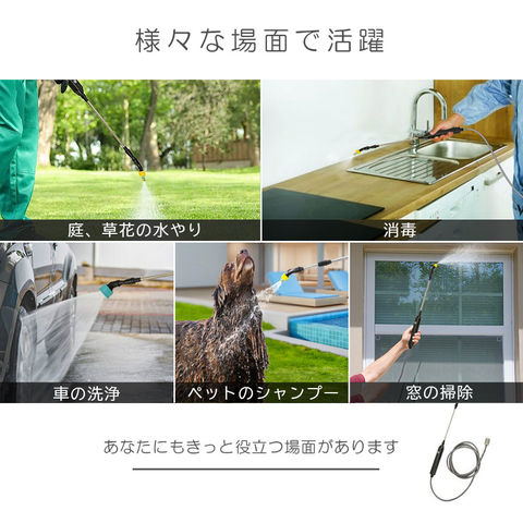 【伸縮できるスプレーバー】スプレーバーの長さはハンドルからの長さ約52~77cmの間で自由に調節でき、長い距離や届きにくい場所にも簡単に噴霧できます。3mもしくは5mの吸水ホースが付属しているので、水源や容器から直接水を取ることができ、容器に左右されません。地面から高い位置に吊るした植木鉢なども簡単に散布できます。花への水やり、殺虫剤の散布、日常の掃除など、さまざまな場面で使用できます。