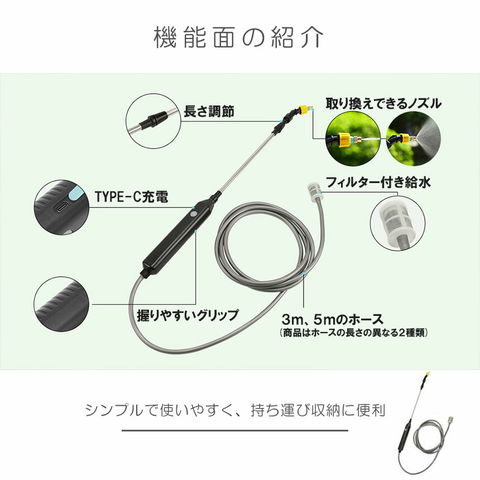 噴霧器 電動 電動噴霧器 伸縮 充電式 霧吹き 軽量 選べるホースの長さ ポータブル Type-C充電 家庭菜園 園芸 畑の水やり 2種類のノズル 吸水ホース 水やり 洗車 農薬 消毒 除草 肥料 散水 園芸水やりなど 家庭の掃除