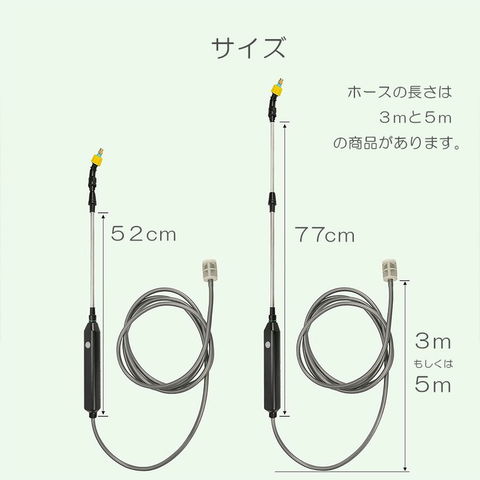 【サイズ、セット内容】ハンドル本体約23cm、噴霧ノズル約52~77cm、ホース3mもしくは5m