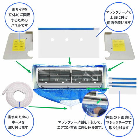 【サポートプレート式固定】この洗浄カバーは2枚のサポートプレートがエアコンの形状に合わせて設計されており、下部にエアコン空調排水の部分にも対応した形状になっております。排水ホースは左か右かにも関わらず、かんたんに置くだけでしっかりと固定できます。エアコン本体にピッタリフィット。