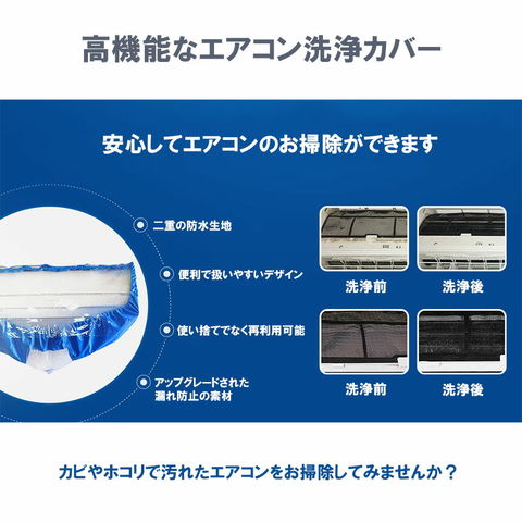 【定期的にエアコンの掃除を】エアコンってついつい掃除せずに長年使いがちですよね?湿気でカビが生えたり、ホコリの付着で性能が落ちたりと、体にとっても経済的にもよくありません。細菌が発生し、呼吸器系の疾病を引き起こしたりしますので定期的に掃除が必要です。自宅のエアコンは本当にきれいでしょうか?ぜひ一度チェックしてみてください。【アップグレードされたカバー 】市場のカバーはプロ仕様ばかりで、家庭でも使いやすい洗浄カバーを提供するために、アップグレードと改良が施されました。サポートプレートを取り付けたり、専門防水カーテンを加えたり、使いやすくしっかりとしたつくりになっています。